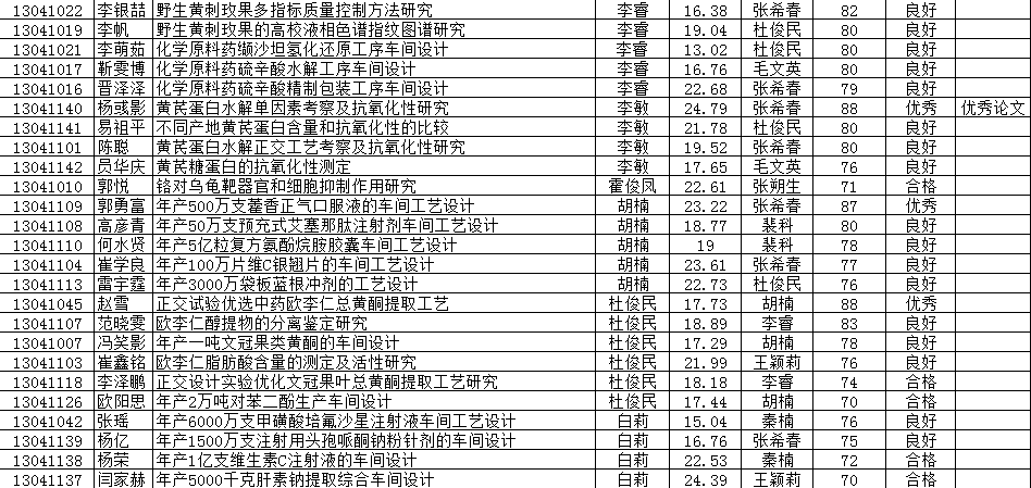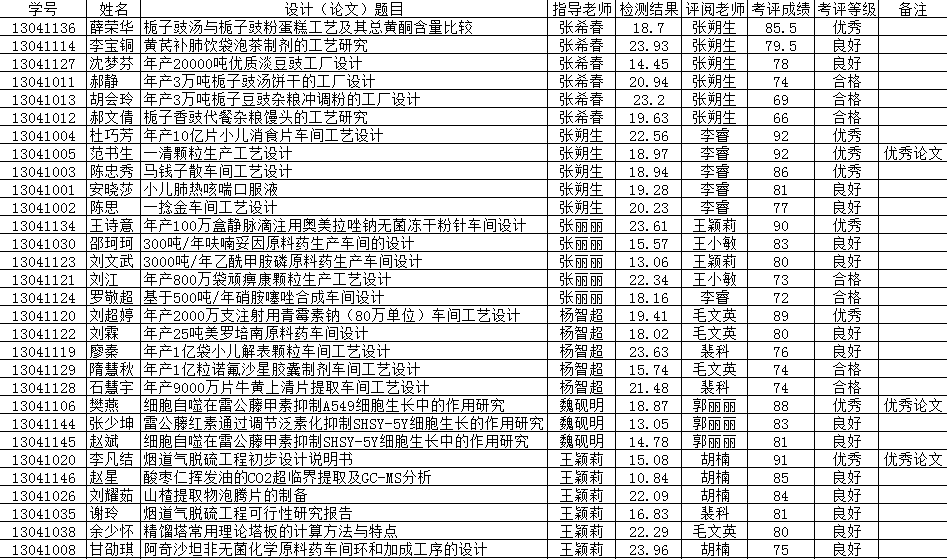 制药与食品工程学院2017届制药工程专业毕业设计(论文)考评成绩