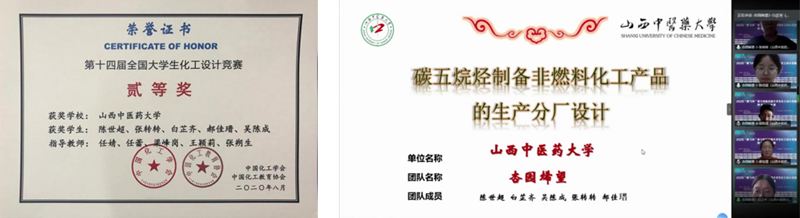 在全国大学生化工设计竞赛中,学院派出5名学生积极克服疫情因素,从今年3月至8月,在网上组队参赛到网上答辩,成功完成全部赛程,获得全国大学生化工设计二等奖。