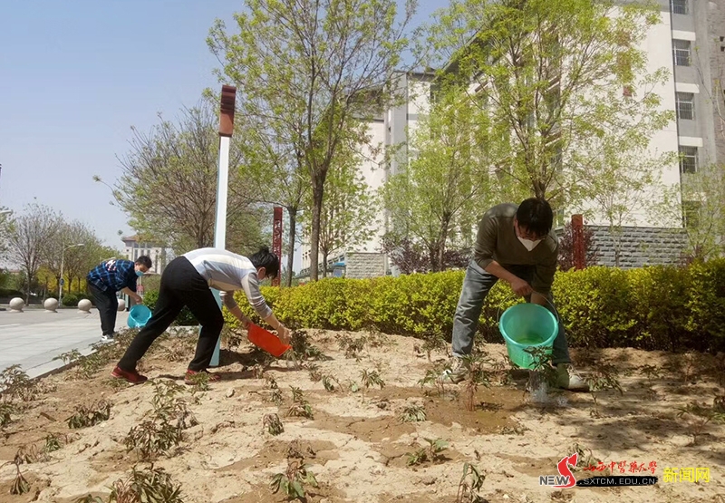 学生党员们认真浇灌药用植物,一棵棵国香牡丹、轮叶八宝、青青鸢尾在绿化带中汲取水分,更加挺拔、翠绿,为春日校园增添了靓色。
