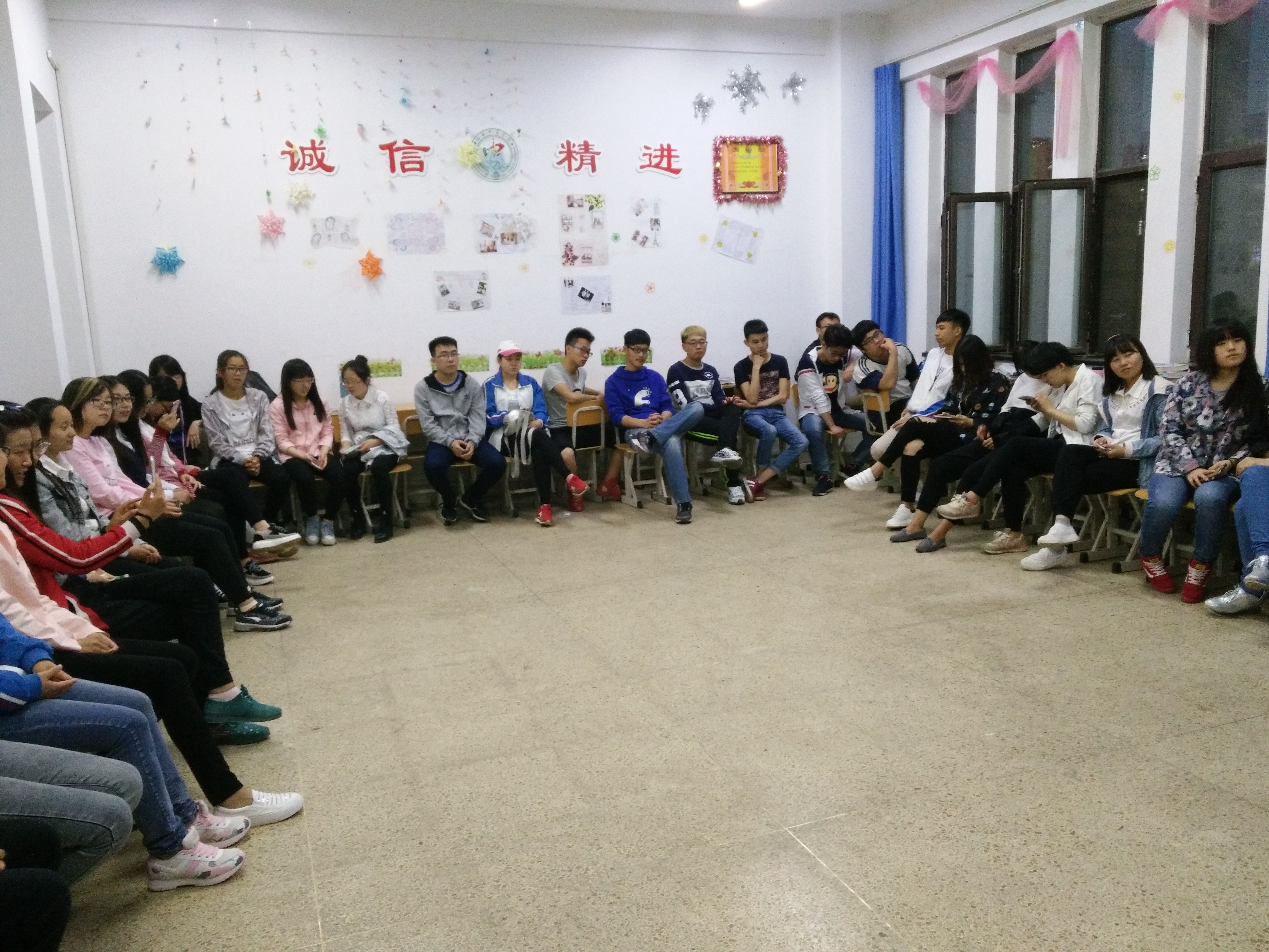随后,由文艺委员李燕和组织委员薛谱优为带领大家一起做集体游戏。在《老男孩》的歌声中开始了第一轮的游戏“胜者为王”。接着大家又共同参加了“南辕北辙”“我画你猜”等游戏,最后的“信任背投”将本次班会推向了高潮,这个游戏不仅是勇气,合作的考验,更是信任的挑战,但是参加游戏的几位同学都圆满完成了任务。