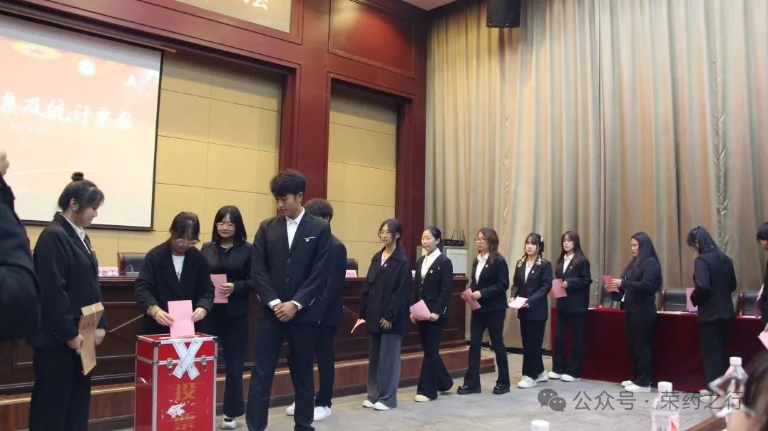 在严谨的投票环节里,学生代表们秉持着公正、客观的态度,以匿名方式进行投票。随后,由计票人统计候选人的票数,监票人宣布投票结果,大会产生了新一届的学生会主席团及常任委员。