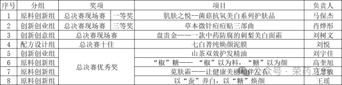 指导老师秦楠、张文芳以其深邃的专业洞察与不懈的匠心培育,引领学子在全国大学生绿色化妆品创新创意大赛中脱颖而出,荣获"优秀指导老师"殊荣。此外,“七白菁纯焕颜泥膜”获得配方设计组总决赛十佳奖,“山茶双效护发精油”获得创新创业组总决赛优秀奖,“‘椒’糖—— ‘椒’以为料,‘糖’以为颜”、“苋肤霜——让健康美丽相伴左右”、“以‘蚕’养白,以‘糖’焕颜”三个项目获得原料创新组总决赛优秀奖,详情如下。