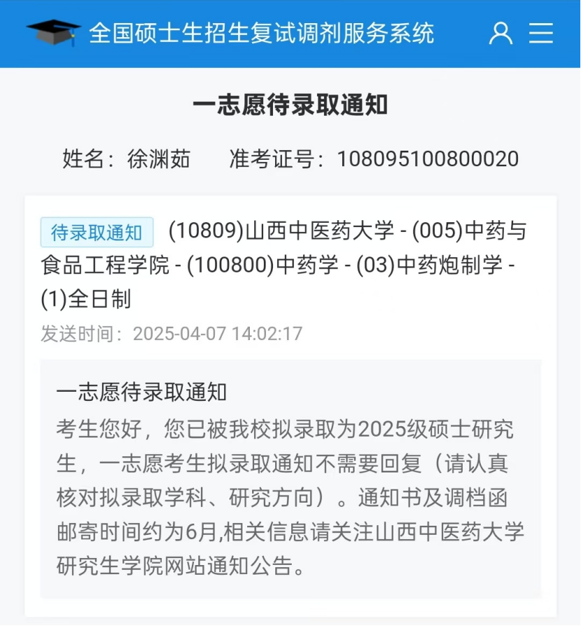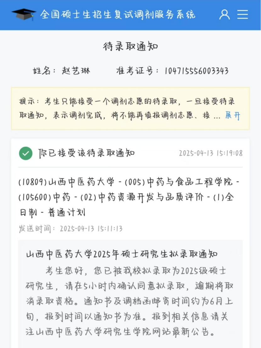 赵艺琳在考研备考时,凭借自身的努力与自律,在考研路上成功叩响taptap点点官方网站的大门,被中药资源开发与品质评价专业录取。在备考压力巨大的时期,赵艺琳不仅专注自身学业,还化身宿舍 “气氛调节师” ,为室友驱散压力阴霾,以积极乐观的态度感染身边人,以实际行动诠释了奋斗路上的团结与担当。