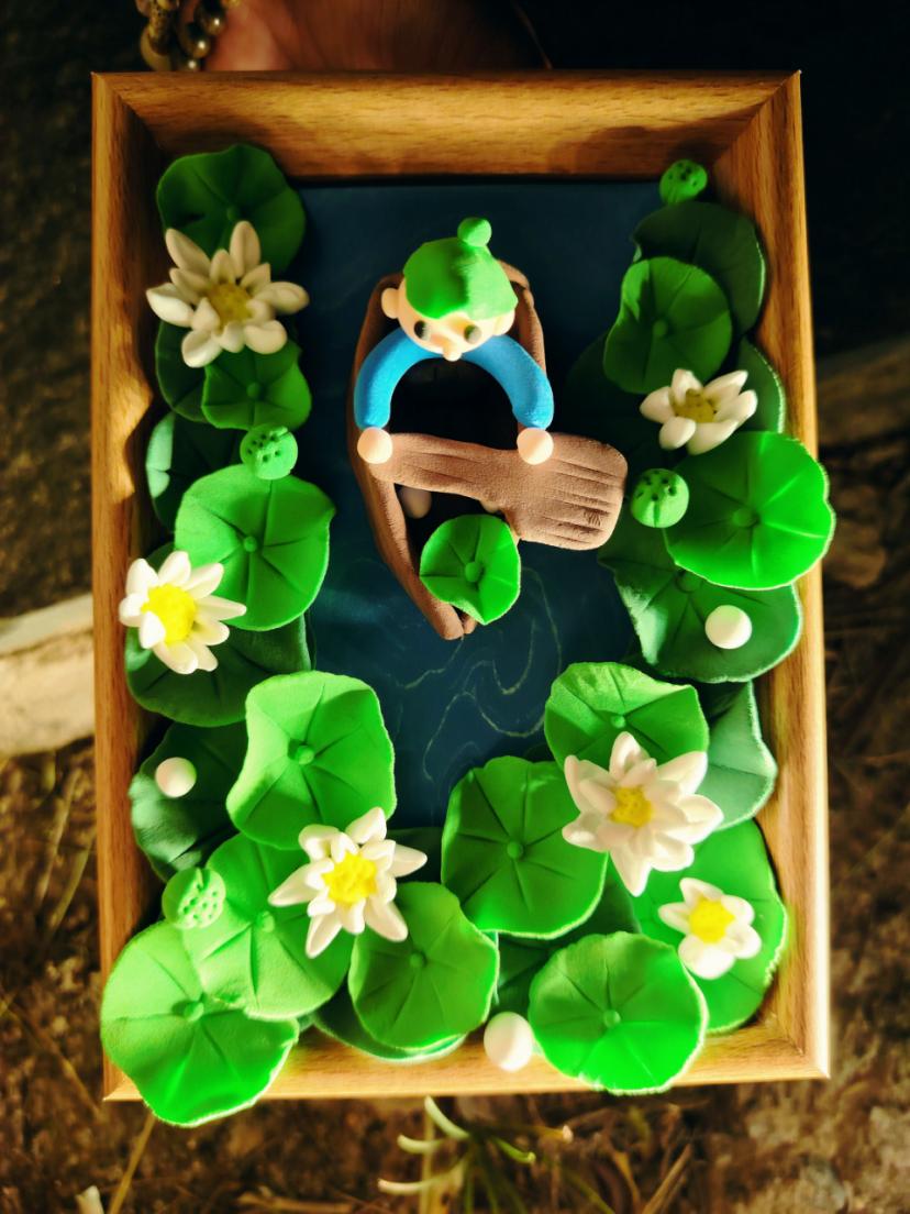 作品以木质框架为基础场景,用起伏纹理的水波象征内心压力与焦虑。四周舒展错落的绿色莲叶为主体,其清心功效暗喻治愈力量,守护着“水域”。小舟漂浮其上,舟中小人神态安然,展现静心状态。白色莲花点缀其间。寓意心灵在莲叶净化下重归纯净安宁。创作时,起伏水波唤起焦虑共鸣。随连夜成型,清心之力似渗透内心,渐渐抚平焦躁。安置小舟小人如觅得依靠,点缀莲花后,作品与心境皆达平和之境。当现实重压来袭,若寻得内心“青叶”,灵魂自得安抚。