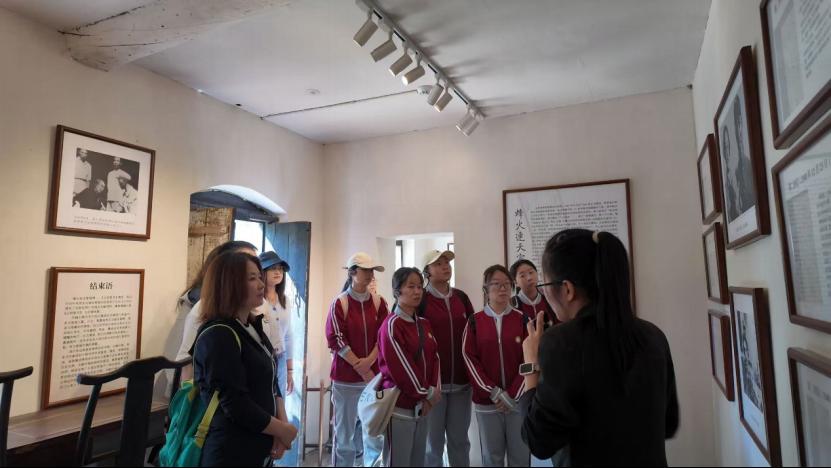 队伍首站抵达左权麻田八路军总部纪念馆,在革命旧址前举行纪念仪式:活动伊始,8 名同学分别携党旗、院旗入场,全体人员肃立行注目礼,以庄重姿态开启这场红色寻访;随后,由学生代表田怡珍、韩永超以 “迎国庆・忆初心 —— 在左权麻田传承抗战精神” 为题发言,回溯左权将军事迹与老区军民鱼水情;最后,学院党委副书记胡松洁带领全体师生党员重温入党誓词,誓言铿锵映初心。