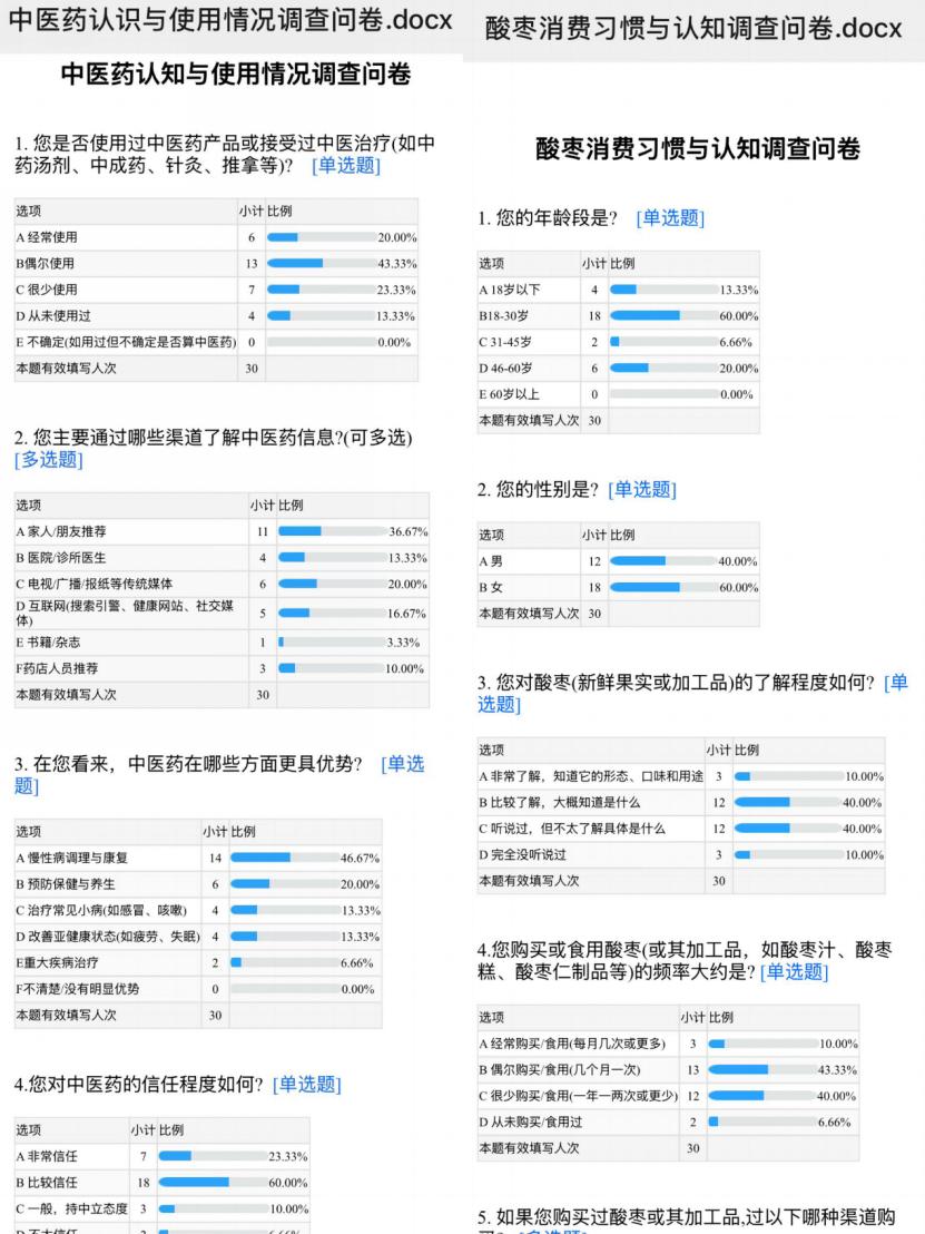 团队创新采用“线上+线下”双轨调研:线上通过社区微信群等渠道发放电子问卷,涵盖中医药认知、酸枣药用价值及使用习惯等;线下分组深入社区人流密集区,发放纸质问卷并面对面指导,保障有效性与回收质量。