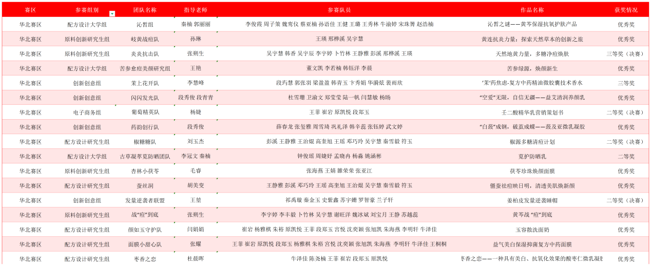 优秀奖(11 支):沁皙组(配方设计大学组,作品《沁皙之谜 —— 黄芩保湿抗氧护肤产品》)、岐黄战痘队(原料创新研究生组,作品《黄连抗炎力量:探索天然草本的创新之旅》)等团队。