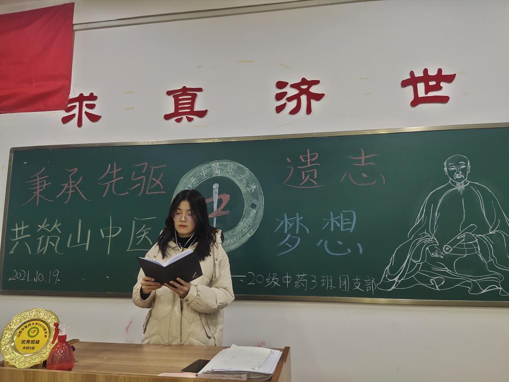 2020级中药3班全体同学,于10月19日晚上七点三十分在和济书院甲座213教室举办“秉承先驱遗志,共筑山中医梦想”主题团日活动。此次活动由团支部书记杨紫悦主持举办,20中药3班同学均在场。