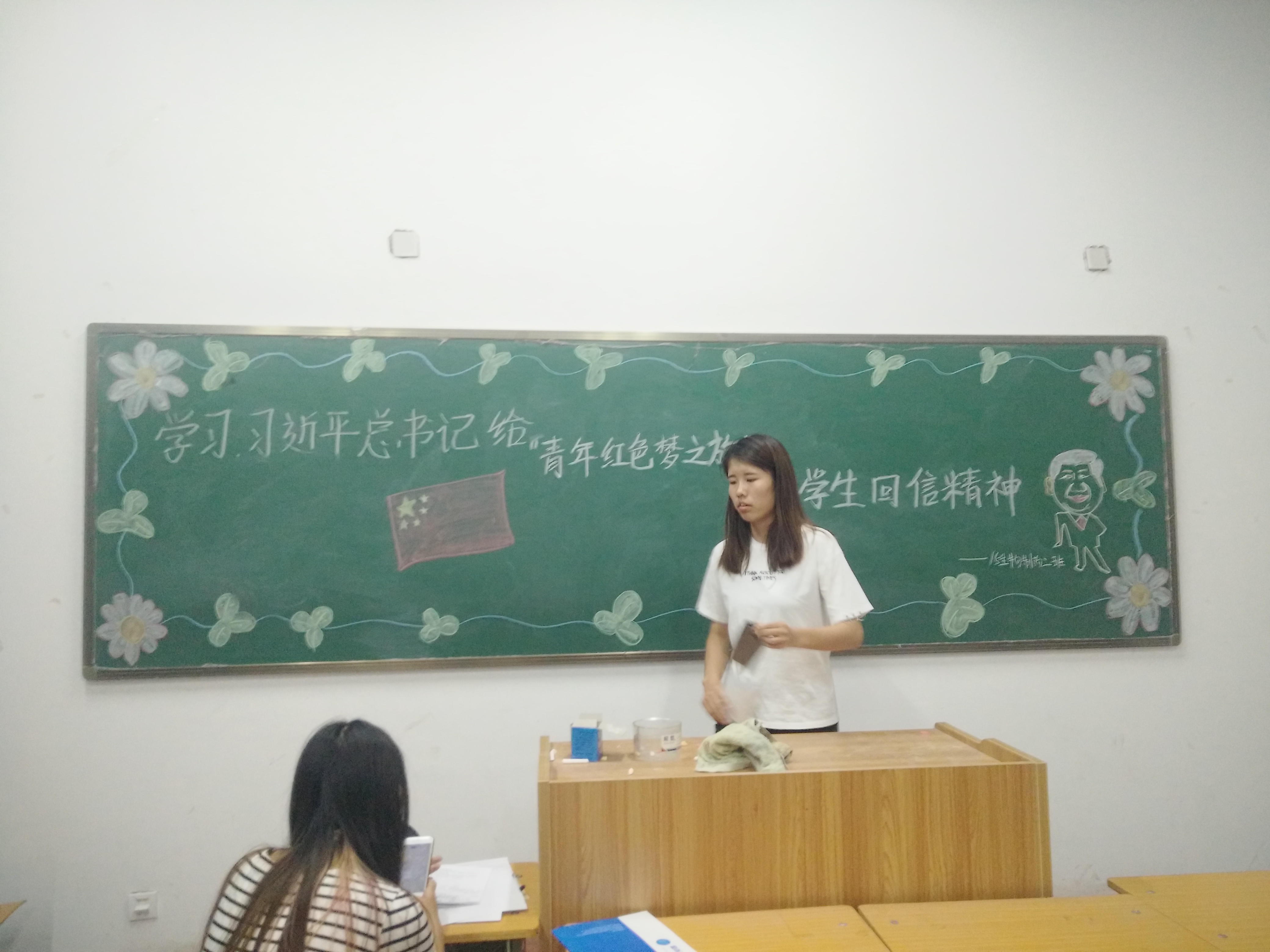 为深入贯彻落实团省委《关于组织全省大学生深入学习宣传习近平总书记给第三届中国互联网+大学生创新创业大赛“青年红色筑梦之旅”大学生回信精神的通知》精神,切实引导和帮助青年学生以习近平总书记系列重要讲话精神为根本遵循,组织引导团员青年深入学习回信的精神实质和丰富内涵,准确把握当代青年肩负的历史使命和成长发展的正确道路,自觉把激昂的青春梦融入伟大的中国梦。本班于2017年9月13日在仁爱书院108室开展以“学习宣传习近平总书记给第三届中国互联网+大学生创新创业大赛‘青年红色筑梦之旅’大学生回信精神”为主题的团日活动。本次团日活动由本班团支书宋秋红主持开展,本班全体同学参加。