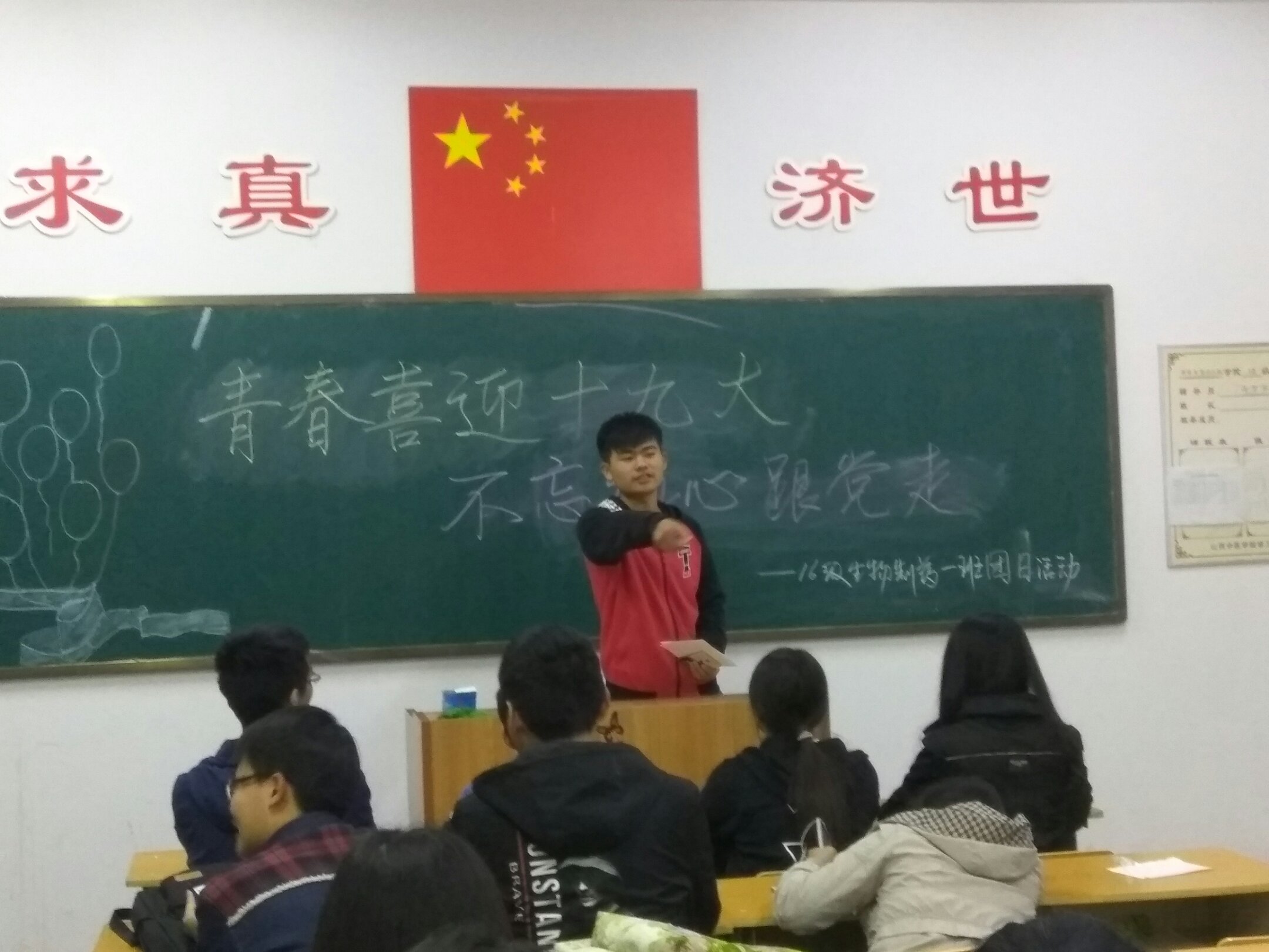 为了更好的迎接和学习十九大精神,学习习近平总书记系列重要讲话,进一步提升taptap点点学生的思想政治素养,2016级生物制药一班全体同学于2017年4月21日晚上七点整,在和剂书院甲座305教室开展“青春喜迎十九大,不忘初心跟党走”主题团日活动。