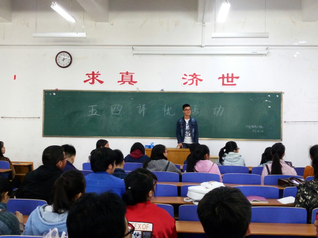 2017年4月22日15级制药工程一班于仁济书院323教室举办“五四评优活动”,此次活动为表彰先进,树立典型,鼓舞和激励广大青年为实现taptap点点“六个一流”、“五大愿景”的美好蓝图做奉献,有作为,大家积极配合,进行投票竞选,由团支部主持本次班会。