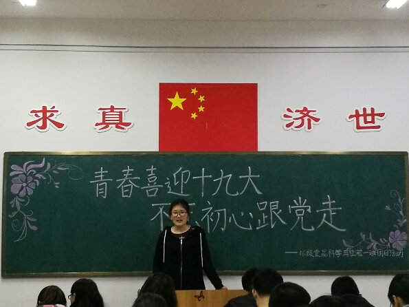 16级食品科学与工程一班全体同学于2017年3月9日早上9点整在和济书院甲座305教室开展以“亲春喜迎十九大,不忘初心跟党走”为主题的团日活动,旨在通过此次团日活动,使同学们对中国共产党的发展历程有一个深入的了解;让同学们缅怀革命先烈,学习先烈为壮丽的共产主义事业奋斗的崇高精神。此次活动由高维哲同学与孙国金同学主持。