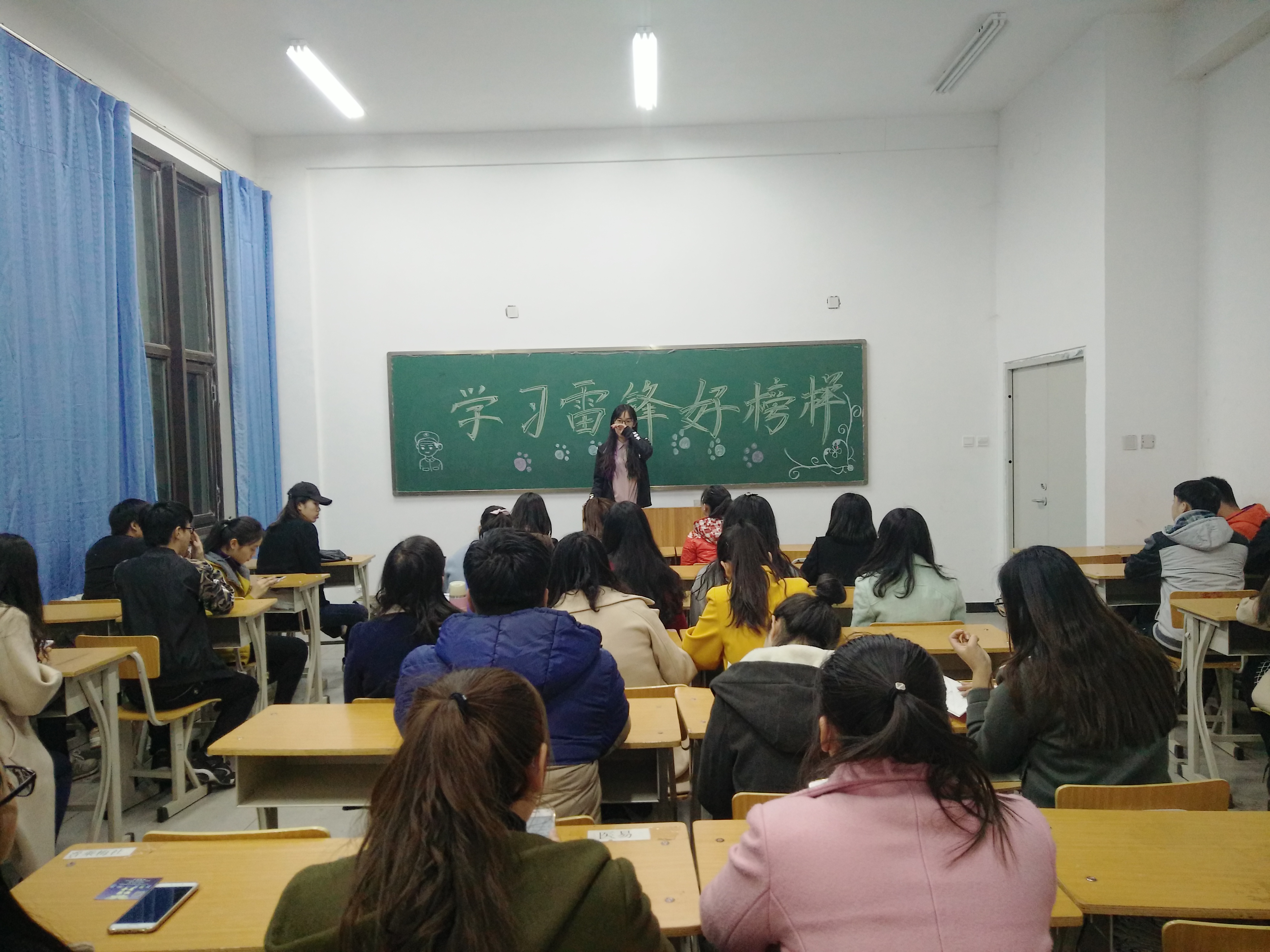 在活动之前,团支书及班长共同组织本班同学打扫本班教室及室外卫生,为我系同学营造了一个良好的学习环境。在活动中,由我班文艺委员史林融开头和同学们一起唱了一首《学习雷锋好榜样》。在歌曲之后,班长何茂玉发表讲话,我们纪念雷锋,发扬雷锋精神,并非只在每年的3月5日,走出宿舍,走进校园,做几件惠民益众的好事,然后又把雷锋和雷锋精神尘封一年,我们开展学雷锋活动旨在,使同学们再更深层次把握和理解学习雷锋、发扬雷锋精神的重要意义。