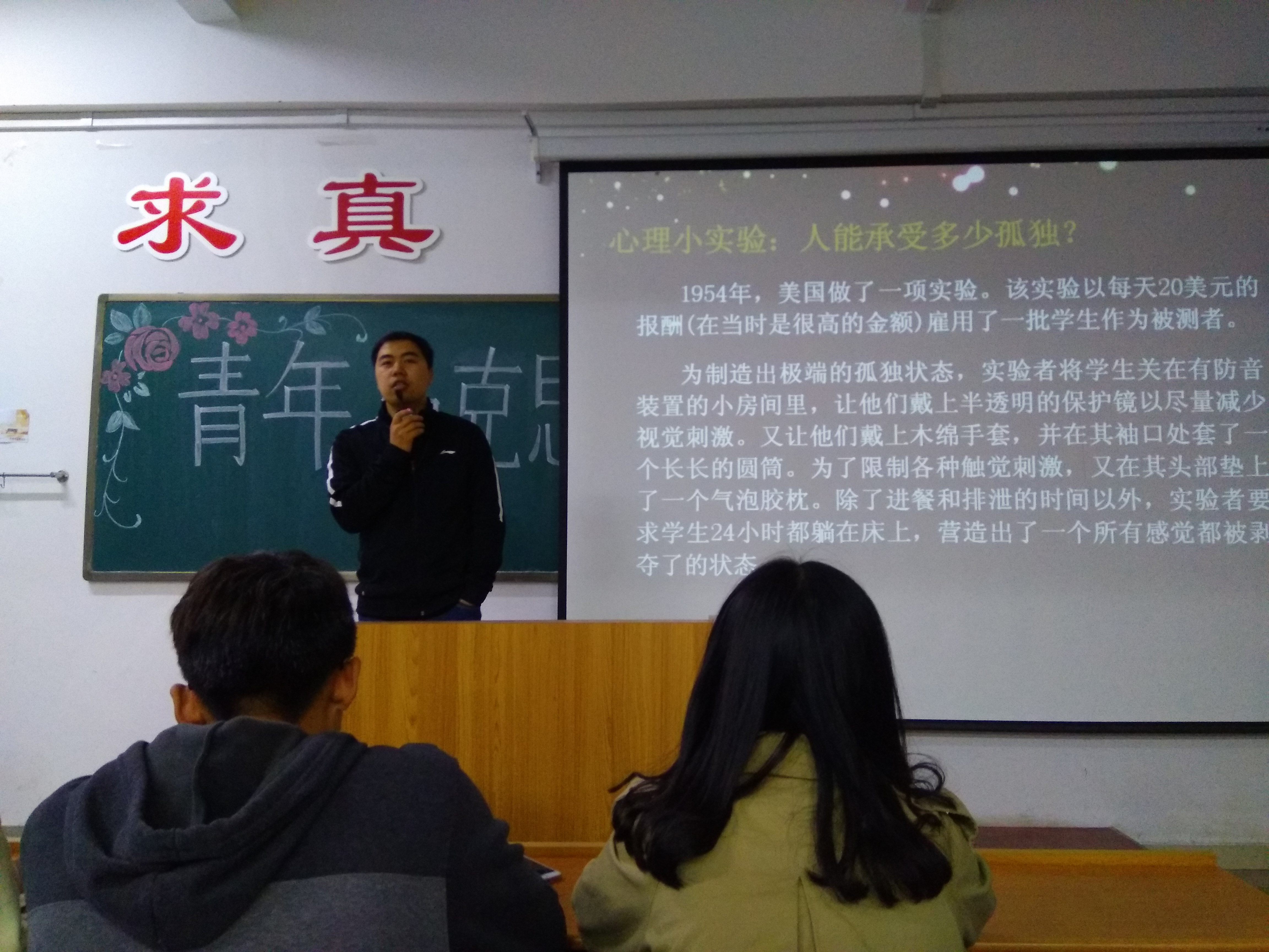 在课程开始,首先由学生会主席张薇薇发言,交代了课程培训的相关事宜。接下来由生活部部长带领大家歌唱共青团团歌。歌曲歌唱完毕,课程正式开始。本次课程主要内容是大学生心理健康。李龙老师首先向同学们介绍了心理健康的基本概念,然后结合一些有意思的故事向同学们传播健康积极的心态。在课程进行到一半时,李老师和同学们一起做游戏,让同学们在玩乐中体会到心理的秘密。如花的季节,如歌的岁月,让我们用自己年轻的心去感受生命的活力、去体会真情的温暖、去享受心灵的阳光。在课程结尾,李龙老师鼓励同学们提出自己的问题,帮助同学们解决。