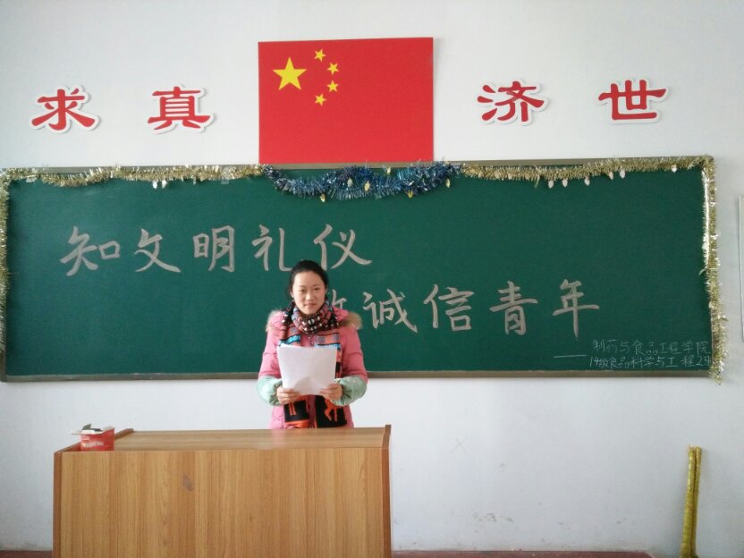 诚实守信是社会主义职业道德建设的重要规范,是所有从业人员在职业活动中必须而且应该遵循的行为准则。但是近年来不断引发诚信危机,很多不诚信的现象与行为已在大学校园中凸显。为加深大学生对文明礼仪,诚信做人的认识,2016年12月21日,14级食品科学与工程2班于和剂书院甲座208教室展开了“诚信青春你我他”团日活动,本次活动由班长薛欣主持,全体同学共同参加。
