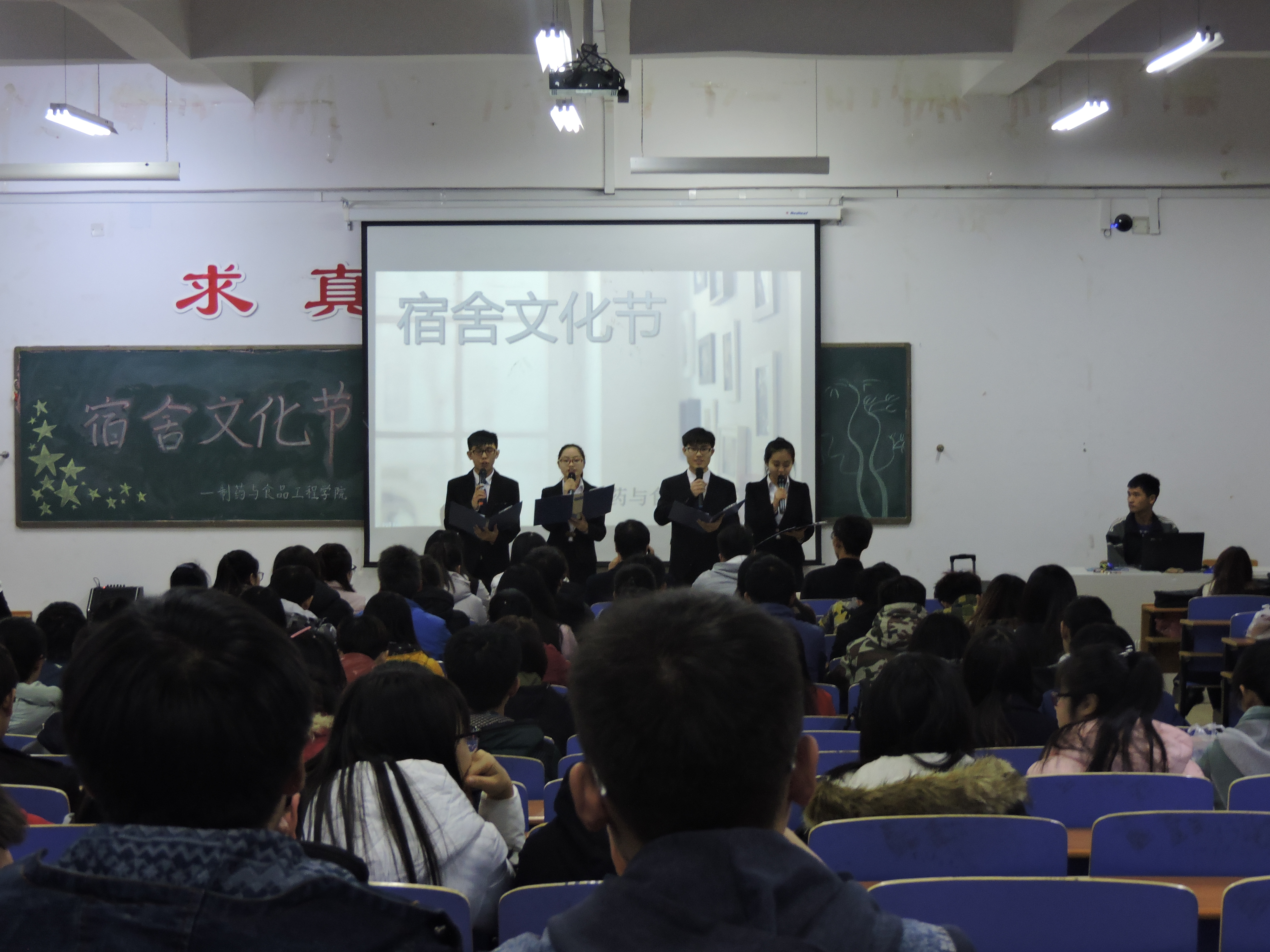 为丰富大学生宿舍文化生活、促进学部学风和班风建设、拉近同学间的距离、展现校园公寓文化风采,营造团结、求实、积极、进取的公寓文化氛围、创造和谐的公寓环境,2016年12月1日制药与食品工程学院在仁济书院甲座117教室举办宿舍文化节活动之决战夜。该活动由制药与食品工程学院生活部主办,李龙、孟喆老师出席活动并担任评委,制药与食品工程学院学生会主席、副主席、各部门部长以及学生代表参与此活动评分。此活动由文艺部干事李波、刘昱、郭帅、孟维娜主持。