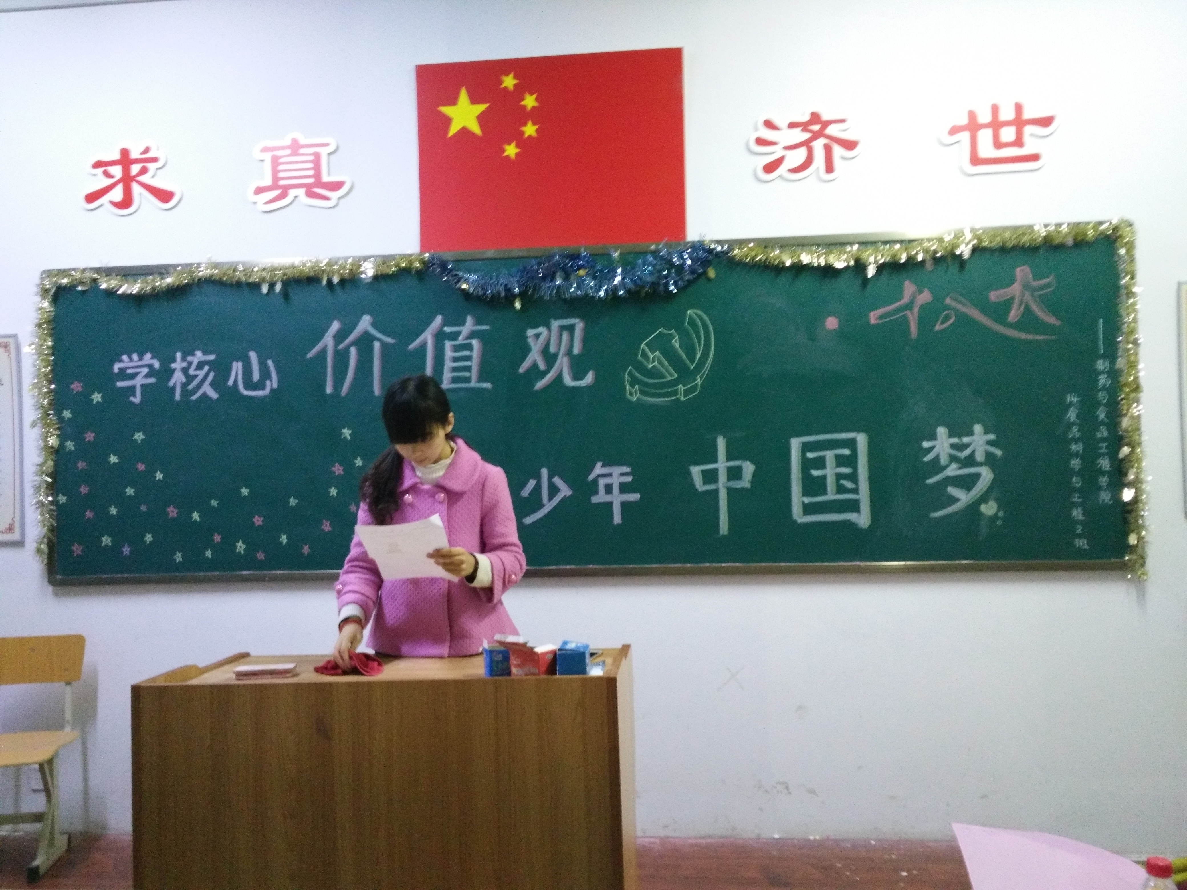 为了培育和践行社会主义核心价值观,推进中国特色社会主义伟大事业、实现中华民族伟大复兴中国梦的战略任务,14级食品科学与工程2班于2016年11月23日星期三,在和剂书院甲座208教室开展了践行社会主义核心价值观团日活动,本次团日活动由团支书杨巧兰策划并主持,全体同学共同参加。