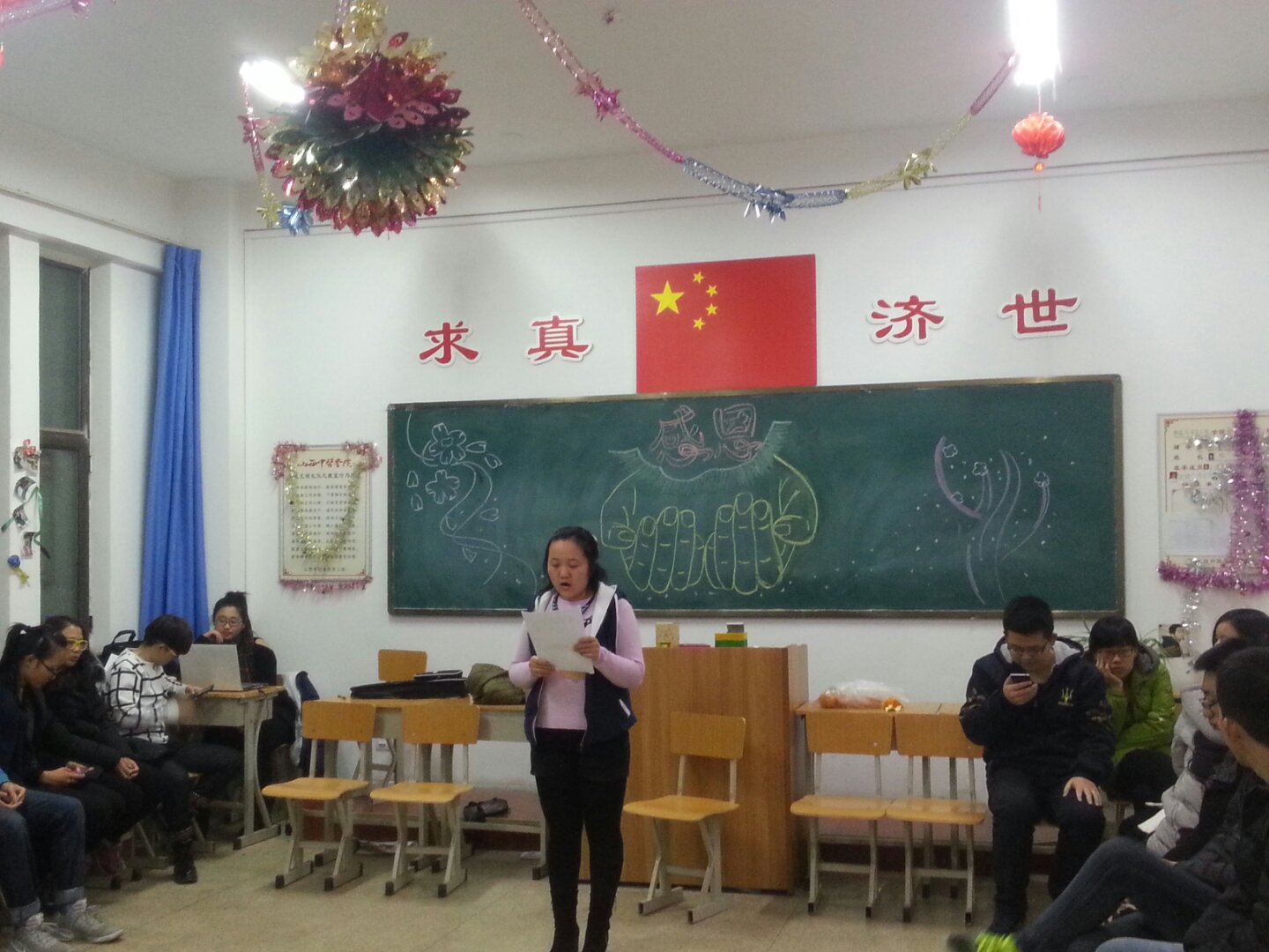 滴水之恩,当以涌泉相报;哺育之情,当以跪乳为报.14级食品科学与工程3班全体同学于2016年11月24日在药学楼306教室举办了感恩节心理活动。活动由王柠同学主持。