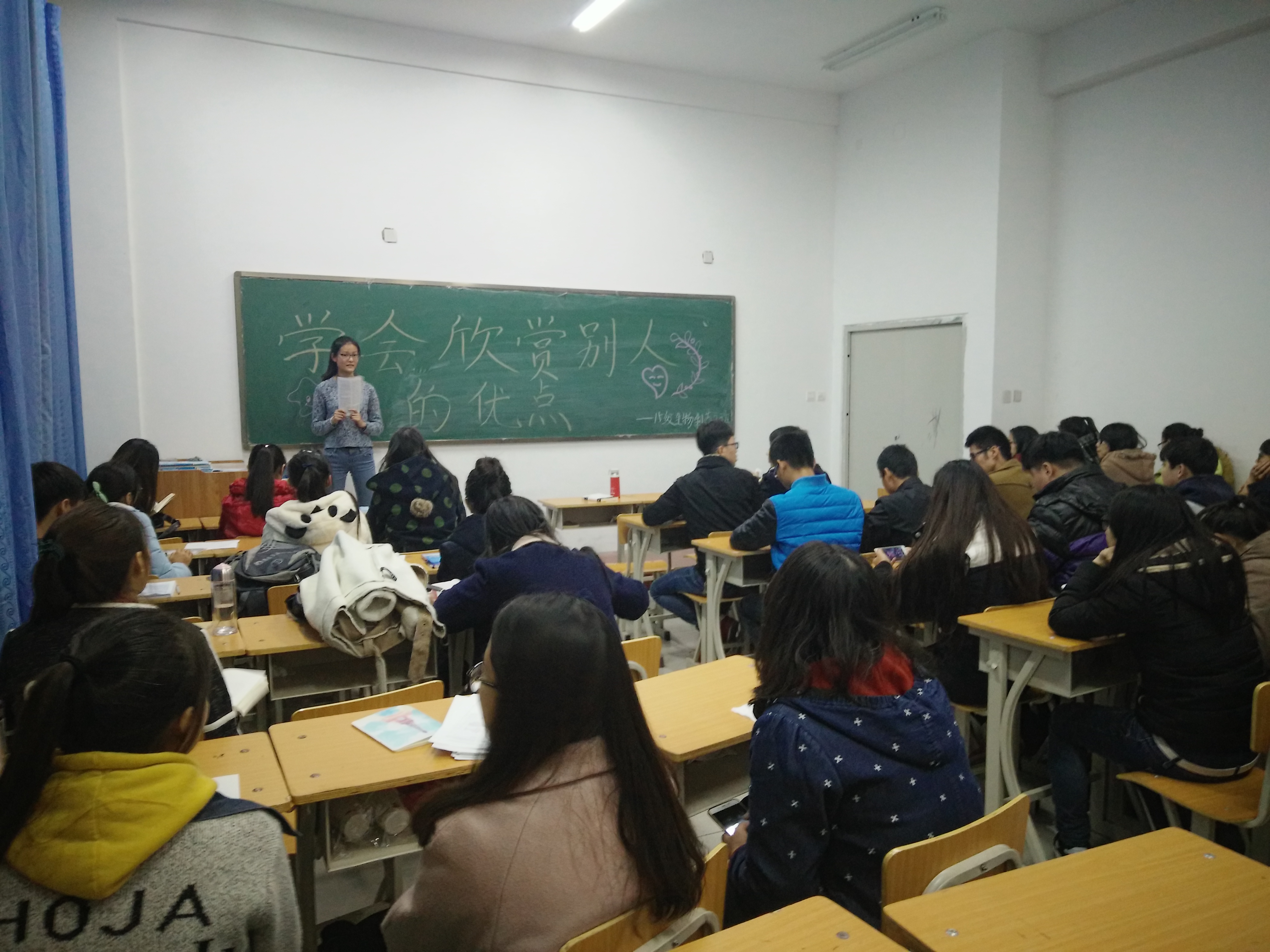 人无完人,金无足赤。生活在世上的每个人都有自己的优点和缺点。很欣赏电影明星徐帆的那句话:“我从不把“完美”二字用于人。有优点又有缺点才能叫作人。”为了让同学们善于发现他人的长处,真正学会欣赏他人优点。本班于2016年11月24日晚8点于仁爱书院106室召开以“学会欣赏别人的优点”为主题的心理活动。此次活动由本班全体同学参加,由心理委员张予涵同学主持,全班同学参加。