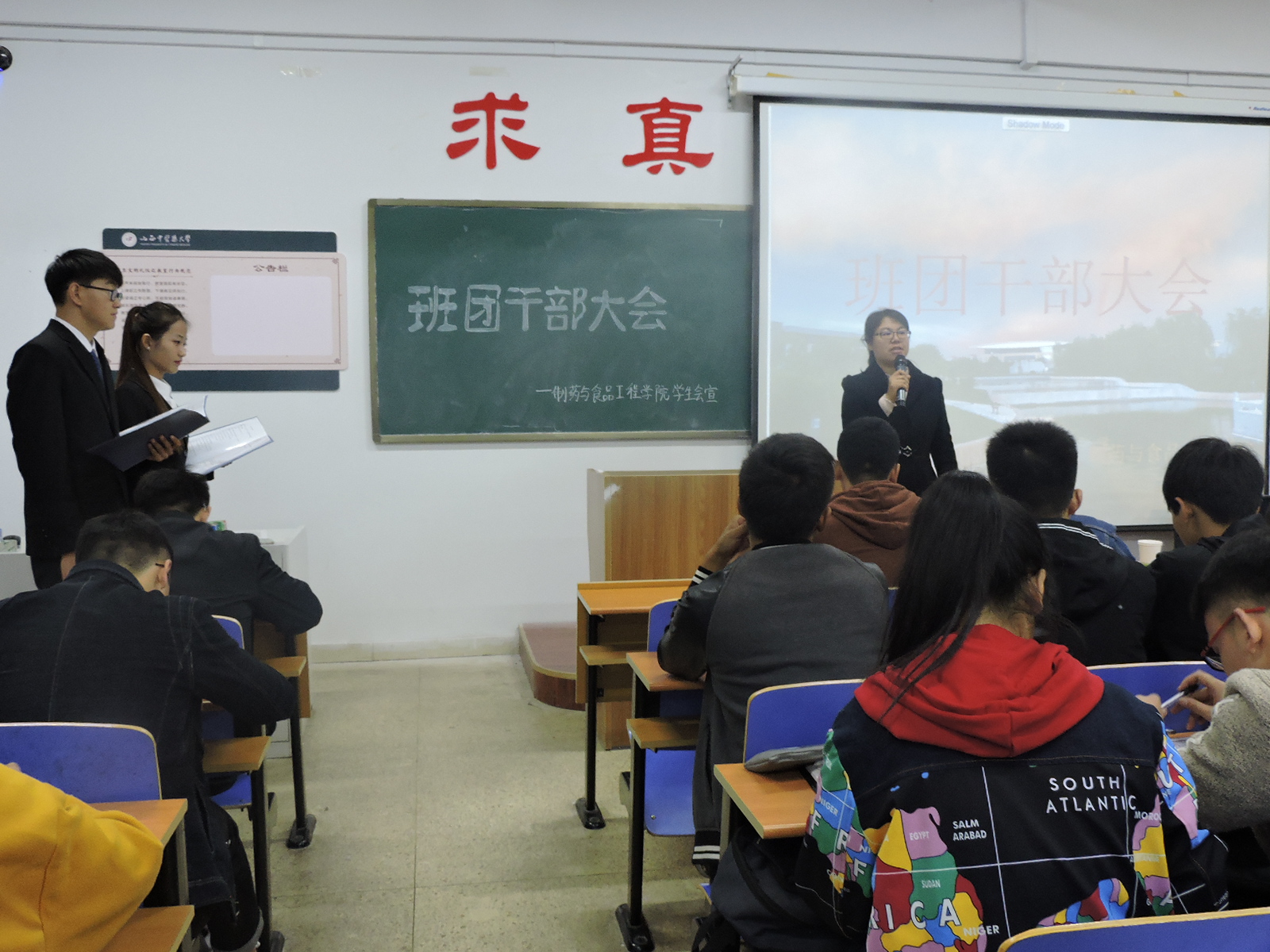 2018年10月14日晚上六点30分,taptap点点于和剂书院甲座210教室举行班团干部大会。出席此次大会的有:制药与食品工程学院辅导员李春江老师、学生会主席杜仲阳、副主席史满平、学生会各部部长以及16、17、18级各班班团干部。此次活动的目的是班长对本班开学来的上课上操情况的总结以及各部门候选人对学生会上一年的工作总结。